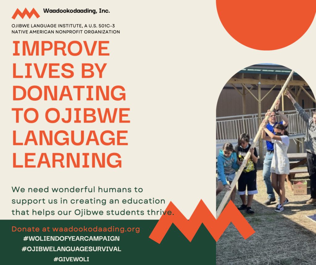 Your donation is needed and greatly appreciated! Any donation amount will help our teachers and students achieve in- school and outdoor Ojibwe language education while helping save and preserve the language and cultural knowledge of Ojibwe communities for generations to come. Join our mission #OjibweLanguageSurvival